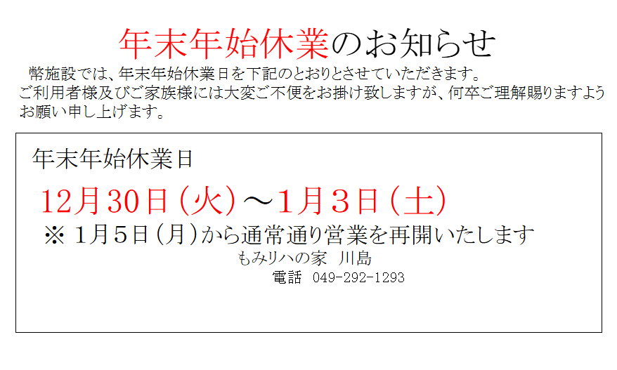 【もみリハの家川島】年末年始休業のお知らせ